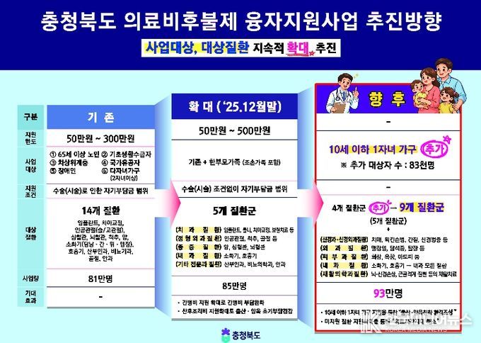 충청북도는 여기에서 더 나아가 지원 대상을 10세 이하 자녀를 둔 한 자녀 가정까지 확대하고, 신경과·외과·피부과·재활의학과 등 4개 질환군을 추가해 기존 5개 질환군에서 총 9개 질환군으로 확대할 계획이다. 이를 통해 보다 촘촘하고 빈틈없는 지원체계를 구축한다는 방침이다.