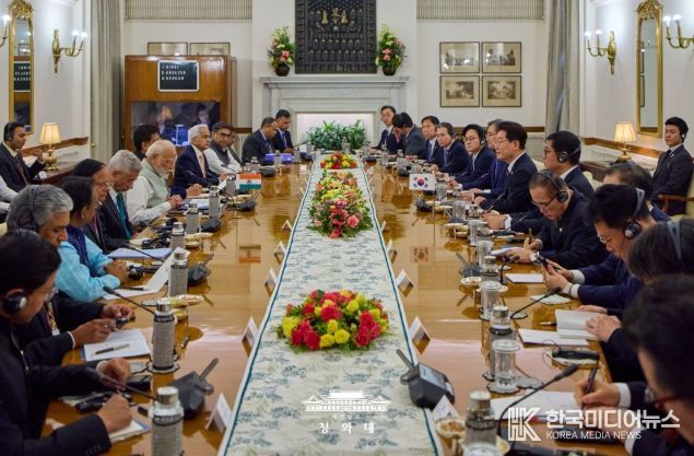 이 대통령은 인도의 인구와 GDP 규모에 비해 우리 교민 수는 1만 2000명, 우리 진출 기업 수는 670여 개 정도로 한-인도 관계가 정체돼 있다면서, 이번 회담을 통해 민간 교류, 경제 협력, 안보 협력 등 지금과는 차원이 다른 협력을 해 나가자고 했다.