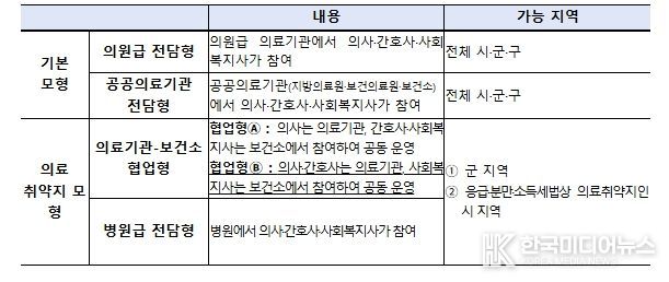 이번 공모에 신설된 모형을 포함한 재택의료센터 참여 모형은 다음 표와 같다.