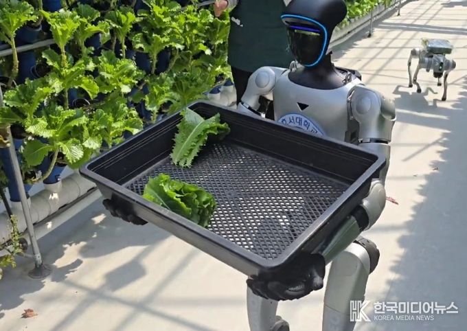 [ 한국미디어뉴스 이원영 기자 ] 아산시는 지난 16일 아산시농업기술센터 내 국내 최초 수직형 스마트팜 온실에서 호서대학교 지능로봇학과 김정주 교수와 로봇융합연구실(RCL) 연구팀이 참여한 가운데, 휴머노이드 로봇과 4족 보행 로봇을 활용한 첨단 농업기술 시연회를 개최했다.