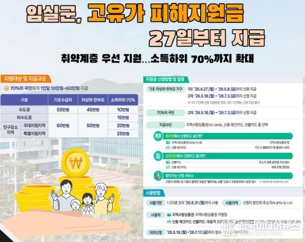 [ 한국미디어뉴스 이종철 기자 ] 임실군이 최근 중동지역 긴장 고조에 따른 고유가‧고물가 상황 속에서 군민들의 생활안정을 지원하기 위해 ‘고유가 피해지원금’을 지급한다.