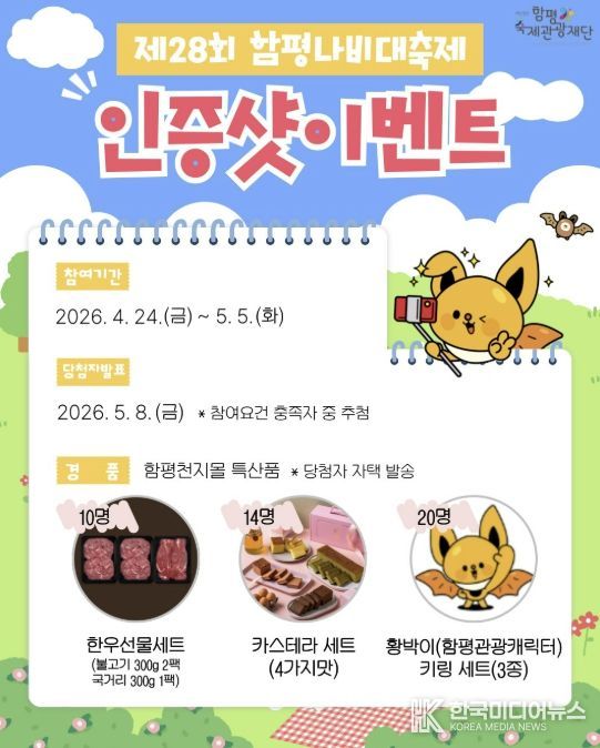 [ 한국미디어뉴스 이종철 기자 ] 전남 함평군이 제28회 함평나비대축제를 맞아 축제의 생생한 현장 분위기를 알리고 관람객의 참여를 확대하기 위해 SNS 인증 이벤트를 진행한다.