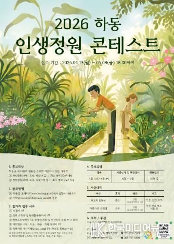 [ 한국미디어뉴스 김홍철 기자 ] 하동군이 지역 내 아름다운 정원을 발굴하고, 일상생활 속 정원 문화를 확산하기 위한 ‘2026년 제2회 하동 인생정원 콘테스트’를 5월 8일까지 진행한다.