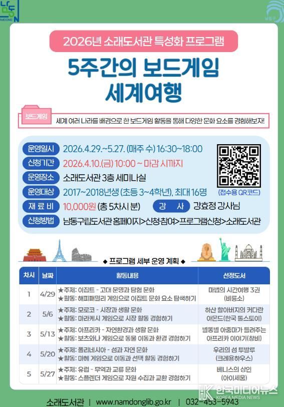 [ 한국미디어뉴스 김만길 기자 ] 인천시 남동남동구립도서관은 지역주민들에게 다채로운 독서문화 체험의 장을 제공하기 위해 ‘2026년 특성화 프로그램’을 운영한다고 22일 밝혔다.