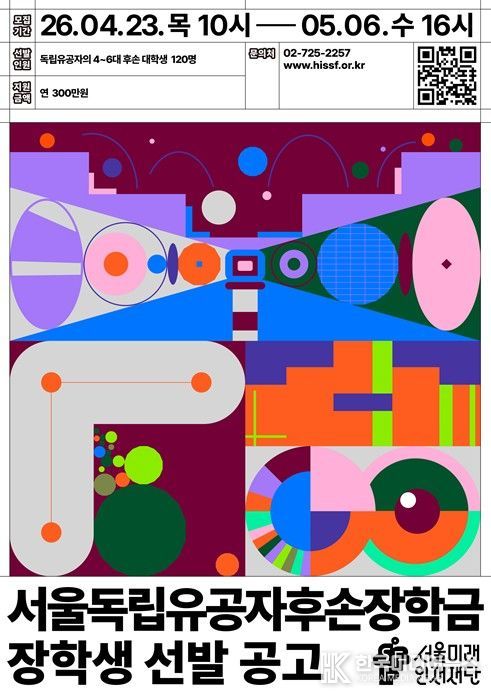 [ 한국미디어뉴스 이원영 기자 ] 서울미래인재재단은 독립유공자(순국선열‧애국지사)의 증손자녀 이하 4~6대 후손 120명을 선발해 1인당 연 300만 원(150만 원 2회 분할 지급)씩 총 3억 6천만 원 규모의 장학금을 지원하는 ‘서울독립유공자후손장학사업’을 추진한다.