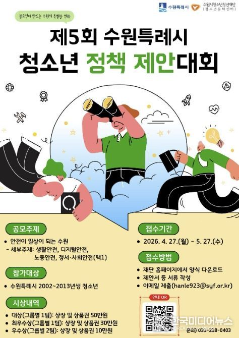 [ 한국미디어뉴스 김일규 기자 ] 수원시청소년청년재단 수원청소년문화센터는 청소년이 정책을 기획하고 제안하는 ‘제5회 수원특례시 청소년 정책 제안대회’ 참가팀을 4월 27일부터 5월 27일까지 모집한다.