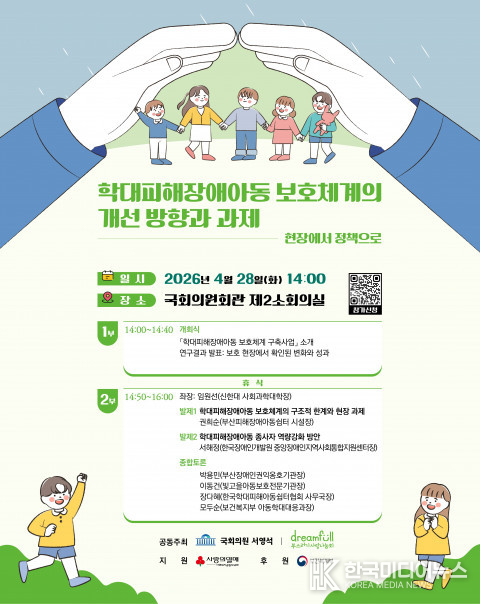 [ 한국미디어뉴스 이원영 기자 ] 2026년 4월 24일 -- 사단법인 부스러기사랑나눔회(대표 윤종선)와 서영석 국회의원이 오는 4월 28일 오후 2시 국회의원회관 제2소회의실에서 정책 포럼 ‘학대피해장애아동 보호체계의 개선 방향과 과제: 현장에서 정책으로’를 개최한다.