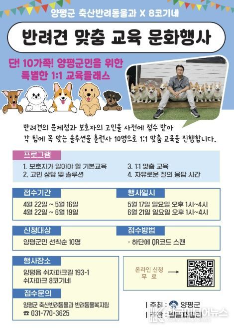 이번 교육은 양평 쉬자파크에서 5월 17일과 6월 21일 오후 1시부터 4시까지 진행되며, 회차별 사전 신청을 통해 선정된 10팀씩 총 20팀을 대상으로 운영된다. 특히 양평군 홍보대사이자 45만 구독자를 보유한 유튜브 채널 ‘8코기네’의 전승우 훈련사와 반려견 행동전문가 10명이 참여해 일대일 맞춤형 야외 실습과 현장 교정 지도를 제공할 예정이다.