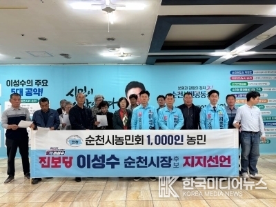 [ 한국미디어뉴스 최영재 기자 ] 순천시 농어민 1,000인이 제9회 전국동시지방선거를 앞두고 진보당 이성수 순천시장 후보에 대한 압도적인 지지를 선언했다. 순천시농민회 소속 농민들은 24일 오전 11시, 이성수 후보 선거사무소에서 기자회견을 열고 “땅의 정직함을 닮은 정치, 순천 농업의 숨통을 틔울 이성수 후보를 적극 지지한다”고 밝혔다.