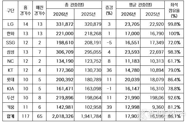 [ 한국미디어뉴스 이원영 기자 ] 2026 신한 SOL KBO 리그가 오늘(25일) 열린 잠실, 문학, 광주, 고척, 대전 경기에서 총 9만 9,905명이 입장하며 200만 관중을 달성했다.