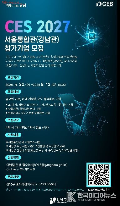 [ 한국미디어뉴스 이보영 기자 ] 꿈이 모이는 도시, 미래를 그리는 강남구가 세계 최대 IT·전자 전시회인 CES 2027을 무대로 관내 스타트업의 글로벌 진출 지원에 나선다. 강남구는 ‘CES 2027 서울통합관(강남관)’에 참여할 스타트업을 4월 22일부터 5월 12일까지 모집한다.
