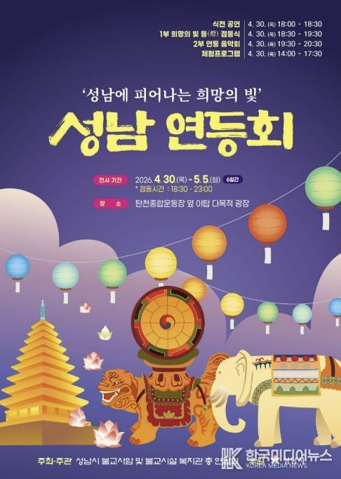[ 한국미디어뉴스 이원영 기자 ] ‘2026 성남 연등회’가 오는 4월 30일부터 5월 5일까지 엿새간 분당 탄천 야탑 다목적광장(탄천종합운동장 앞)에서 열린다.