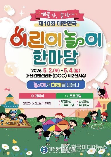 [ 한국미디어뉴스 이원영 기자 ] 대전시교육청은 제104회 어린이날을 맞아 오는 5월 2일부터 4일까지 3일간 대전컨벤션센터(DCC) 제2전시장에서 ‘제10회 대한민국 어린이 놀이 한마당’을 개최한다고 밝혔다.
