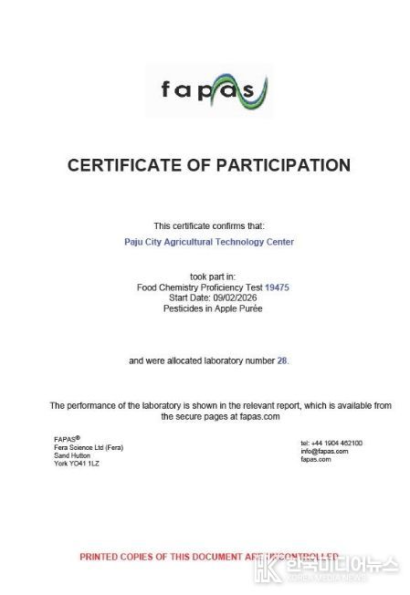 [ 한국미디어뉴스 기자 ] 파주시 농산물 안전분석실이 국제적으로 공신력 있는 잔류농약 분석 능력 평가에서 4년 연속 우수한 결과를 달성하며 세계 수준의 분석 역량을 입증했다.