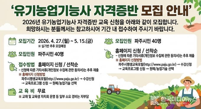 [ 한국미디어뉴스 기자 ] 파주시농업기술센터는 친환경농업 분야 농업 전문 인력 육성을 위한 '2026년 유기농업기능사 자격증 취득’교육생을 4월 27일부터 5월 15일까지 모집한다.
