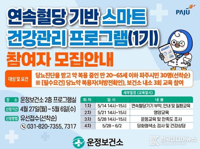 [ 한국미디어뉴스 기자 ] 파주시 운정보건소는 심뇌혈관질환 예방관리사업의 일환으로 ‘연속혈당 기반 스마트 건강관리 프로그램’참여자를 오는 27일부터 10일간 모집한다.