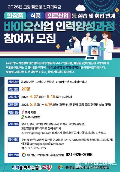 [ 한국미디어뉴스 기자 ] 고양특례시는 2026년 고양맞춤형 일자리학교 공모사업 중 ‘바이오산업 인력 양성과정’의 참여자를 모집한다.