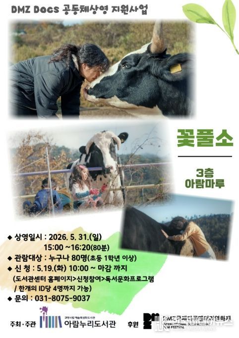 [ 한국미디어뉴스 기자 ] 고양특례시 아람누리도서관은 DMZ국제다큐멘터리영화제와 협업해 오는 5월 31일 오후 3시, 도서관 3층 아람마루에서 다큐멘터리 영화 ‘꽃풀소’ 상영회를 개최한다.