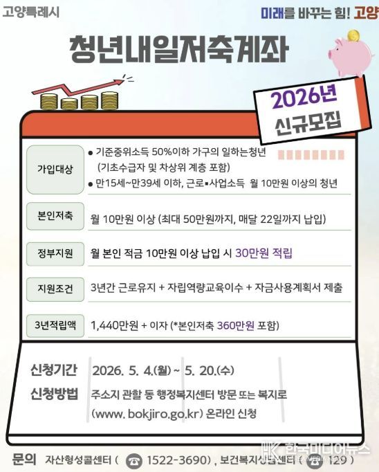 [ 한국미디어뉴스 기자 ] 고양특례시는 5월 4일부터 시작하는 청년내일저축계좌 신규 가입자 모집을 앞두고, 가입 독려에 나섰다.