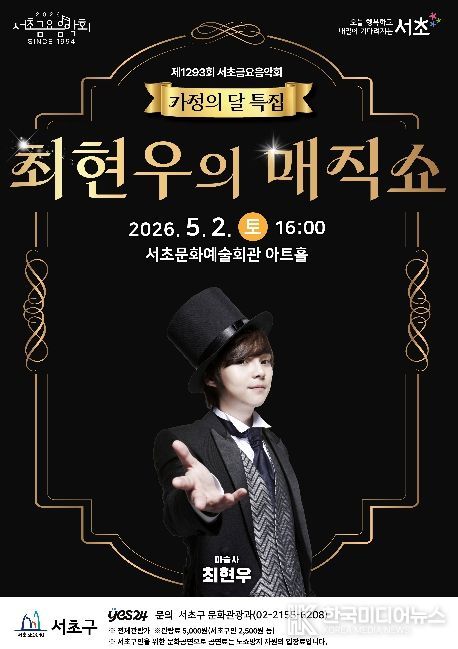 [ 한국미디어뉴스 이보영 기자 ] 서울 서초구가 가정의 달 5월을 맞아 오는 5월 2일 토요일 오후 4시, 서초문화예술회관 아트홀에서 서초토요콘서트 '최현우의 매직쇼'를 개최한다고 밝혔다.