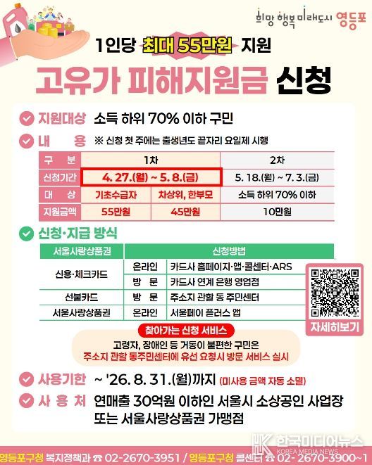 [ 한국미디어뉴스 이원영 기자 ] 영등포구가 계속되는 고유가 상황 속에서 구민들의 경제적 부담을 완화하기 위해 ‘고유가 피해지원금’ 지급에 나선다고 밝혔다. 이번 지원금은 2026년 3월 30일을 기점으로 소득하위 70% 이하인 구민을 대상으로 하며, 소득 수준에 따라 차등 지급된다.