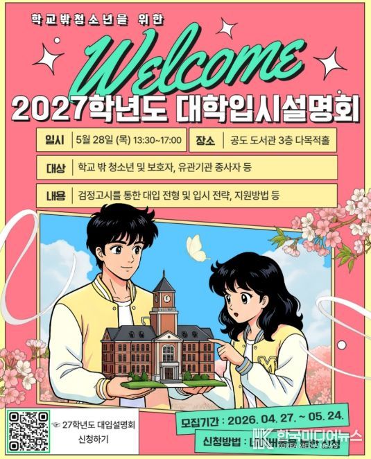 [ 한국미디어뉴스 이보영 기자 ] 안성시학교밖청소년지원센터는 학교 밖 청소년의 성공적인 진학을 돕기 위해 오는 5월 28일 오후 1시 30분부터 공도 도서관 다목적홀에서 ‘2027학년도 대학 입시 설명회’를 개최한다고 밝혔다.