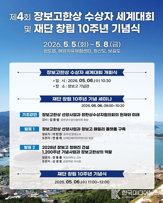 [ 한국미디어뉴스 이종철 기자 ] 사단법인 장보고글로벌재단(이사장 김덕룡)이 창립 10주년 기념식 및 제4회 장보고한상 수상자 세계대회를 5월 5일부터 8일까지 완도에서 개최한다고 밝혔다.
