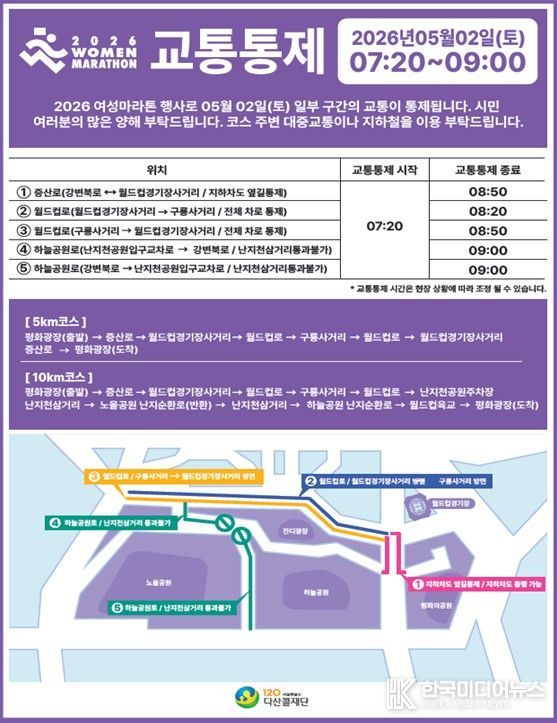 대회 당일인 5월 2일 오전 7시 20분부터 09시까지, 증산로, 월드컵로, 하늘공원로 일부가 단계별로 통제된다.