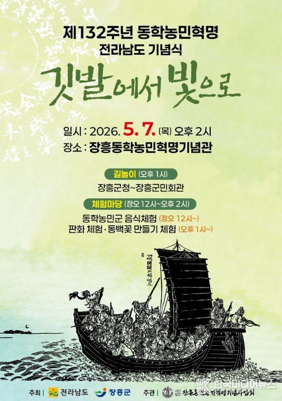 [ 한국미디어뉴스 이종철 기자 ] 전라남도와 장흥군이 공동 주최하고 (사)장흥동학농민혁명기념사업회가 주관하는 ‘제132주년 동학농민혁명 전라남도 기념식’이 5월 7일 장흥에서 열린다.