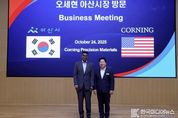 [ 한국미디어뉴스 김서안 기자 ] 아산시는 24일 글로벌 첨단 유리소재 선도기업인 코닝정밀소재㈜를 방문해 임직원들과 간담회를 갖고 지역경제 활성화와 상생협력 방안을 논의했다고 밝혔다. 이번 방문은 코닝정밀소재의 생산 현장을 직접 둘러보고, 최근 디스플레이 산업의 기술 변화와 기업 애로사항을 청취하며 지역 산업 생태계와 연계한 협력 방안 및 지역경제 회복 방향을 모색하기 위해 마련됐다. 간담회에는 오세현 시장을 비롯해 이재성 기획경제국장 등 시 관계자와 반 홀(Vaughn M. Hall Jr.) 코닝정밀소재 대표이사와 임원진 등 20여 명이 참석했다. 양측은 △코닝의 첨단 건축용 유리제품 공공건축물 적용 △아산시 관내 기업 이용 및 청년 현장견학 프로그램 운영 △아산페이 더블혜택 이벤트 홍보 △지역 농산물 이용 등 다양한 상생 협력 과제에 대해 의견을 교환했다. 이 자리에서 오 시장은 “디스플레이 산업은 초고해상도, 대형화, 폴더블 등 기술 패러다임이 빠르게 전환되고 있으며, 그 중심에 코닝의 초박막‧고기능성 유리 기술이 있다”고 평가했다. 특히 “코닝정밀소재는 아산의 미래산업을 함께