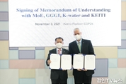 [ 경인TV뉴스 김선근 기자 ] 유제철 한국환경산업기술원장(사진 왼쪽)과 프랭크 라이스베르만 글로벌녹색성장연구소(GGGI) 사무총장은 11월 3일 오후(현지시각) 제26차 유엔기후변화협약 당사국총회(COP26)가 열리고 있는 영국 글래스고 스코티쉬이벤트캠퍼스(SEC) 내 한국홍보관에서 파리협정 이행과 지속가능발전 목표 달성을 지원하기 위한 업무협약을 체결했다. 양 기관은 향후 개발도상국의 탄소중립 및 녹색재건 지원을 위한 ODA사업 발굴과 정책자문, 기술지원 등에 적극 협력할 예정이다.
