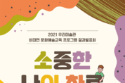 [ 경인TV뉴스 김선근 기자 ] 인천 동구청이 (재)인천문화재단에 위탁하여 운영 중인 우리미술관에서 지역 설화 ‘괭이부리 호랑이’를 바탕으로 한 <소중한 나의 하루> 결과발표회를 10월 8일부터 10월 31일까지 개최한다. 본 문화예술 프로그램은 코로나19 확산을 방지하고자 비대면으로 운영되었으며, 올해는 서림초등학교 4학년 학생(108명)과 송림초등학교 4-5학년 학생(94명)이 참여하였다. 우리미술관은 지역 주민들의 문화향유 기회를 늘리기 위하여 지역 설화인 ‘괭이부리 호랑이’를 바탕으로 비대면 교구와 온라인 영상을 활용한 <소중한 나의 하루> 문화예술 프로그램을 준비하였다. 2021년 9월 한 달간 어린이를 대상으로 프로그램을 진행하였으며, 비대면 프로그램 결과물과 참여과정의 기록을 모아 교내 결과발표회를 개최한다. <소중한 나의 하루> 결과발표회에서는 프로그램에 참여한 학생들의 활동사진과 완성된 작품을 만날 수 있다. 학생들이 꾸민 목공시계와 각자의 희망을 담은 나의 하루 계획표, 하루 일과에 대해 기록한 수첩 등을 엿볼 수 있다. 참여자들이 학교에서 결과작품을 자연스럽게 접하고 감상할 수 있도록 프로그램 참여 학교(인