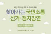 [ 경인TV뉴스 김선근 기자 ] 중앙선거관리위원회 선거연수원은 2022년 제20대 대통령선거를 앞두고 10월 4일부터「찾아가는 국민소통 선거·정치강연」을 운영한다고 밝혔다. 이번 강연은 ‘나의 소중한 한 표’라는 주제로 40명의 선거·정치교육 전문가가 직접 찾아가거나 온라인(ZOOM 등)으로 진행될 예정이다. 강연 내용은 주권의 의미와 가치, 선거참여의 중요성, 선거절차 방법 등으로 이루어진다. 강연을 희망하는 기관·단체 등은 선거연수원, 중앙 및 시·도선거관리위원회 홈페이지에서 신청하면 된다. 선거연수원은 “이번 강연이 대통령선거의 유권자를 대상으로 소통·공감형 선거·정치 교육을 확대하기 위하여 마련된 만큼 많은 관심과 참여를 바란다.”라고 밝혔다.