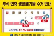 [ 한국미디어뉴스 김풍옥 기자 ] 충북 진천군은 군민들이 명절을 보다 쾌적하게 보낼 수 있도록 추석 연휴 지역 생활 쓰레기 수거 일정을 일부 조정한다고 1일 밝혔다. 오는 4일은 오전에만 쓰레기 수거가 이뤄지며, 연휴 기간 임시공휴일인 8일 하루는 정상적으로 수거 작업을 진행한다. 이에 각 가정에서는 반드시 수거일 전날 저녁에 생활쓰레기를 배출해야 한다. 이와 함께 군은 연휴 기간 발생할 수 있는 불편에 대비해 3일부터 9일까지 ‘생활쓰레기 상황반(043-539-3461~4)’을 운영한다. 최지혜 군 식산업자원과 주무관은 “명절 연휴에도 군민들의 불편이 없도록 상황반 운영에 최선을 다하겠다”며 “정해진 배출 요일과 시간을 잘 지켜주시길 당부드린다”고 말했다.