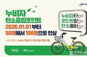 [ 한국미디어뉴스 김홍철 기자 ] 창원특례시는 공영자전거 “누비자” 이용 시민에게 지급하는 탄소중립포인트 인센티브가 2026년 1월 1일부터 1km당 50원에서 100원으로 인상된다고 밝혔다. 탄소중립포인트제는 일상생활에서 온실가스 저감에 기여하는 다양한 실천행동에 대해 현금성 포인트로 인센티브를 제공하는 제도로, 공유자전거로는 전국 최초로 ‘누비자’ 가 선정됐다. 탄소중립포인트 참여방법은 누비자 누리집 또는 앱에 접속하여 회원 가입 후, 탄소중립포인트 녹색생활실천에 회원 가입을 하고 누비자를 이용하면 다음달에 등록된 계좌로 지급된다. 포인트 회원 가입자에 한하여 누비자 1km 이용시 100원씩 1인 1년 최대 7만원까지 포인트가 지급되며, 비회원인 1일 이용권 구매자는 제외되기 때문에 꼭 회원권(주·월·반기·연)을 구매해야 혜택을 받을 수 있다. 이유정 기후환경국장은 “누비자는 짧은 거리 승용차 이용을 대체할 수 있는 대표적인 친환경 교통수단”이라며 “탄소중립포인트 인센티브 인상을 계기로 더 많은 시민이 누비자를 이용해 건강도 지키고, 탄소중립실천에 동참해 주시길 바란다”라고 말했다.