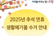 [ 한국미디어뉴스 문상수 기자 ] 고양특례시는 다가오는 추석 연휴를 맞아 시민들이 쾌적하고 깨끗한 환경 속에서 명절을 보낼 수 있도록 ‘추석 연휴 생활쓰레기 관리대책’을 수립해 본격 추진한다. 시는 10월 3일부터 9일까지 연휴 기간 동안 상황반과 기동청소반을 운영해 각종 민원과 긴급 상황에 신속 대응하고, 생활쓰레기와 무단 방치쓰레기를 집중 수거할 예정이다. 아울러 연휴 기간 쓰레기 배출일 사전홍보와 쓰레기 상습 투기 우려지역에 대한 집중 단속도 병행한다. 특히, 10월 8일 대체공휴일에도 생활쓰레기 수거를 정상적으로 실시해 시민 불편을 최소화할 방침이다. 다만, 10월 5일, 6일(월·추석), 7일 3일간은 휴무로 인해 수거가 이뤄지지 않는다. 이에 따라 쓰레기 배출은 반드시 수거일 전날 일몰 이후에 해야한다. 시 관계자는 “쾌적하고 깨끗한 명절 분위기 조성을 위해 추석 연휴 기간 생활쓰레기 수거에 만전을 기하겠다”며 “각 가정에서도 음식물 쓰레기 줄이기, 재활용품 분리배출 등 생활쓰레기 감량에 적극 협조해 주시기를 바란다”고 전했다.