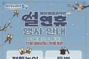 [ 한국미디어뉴스 이보영 기자 ] 시흥시는 설 명절을 맞아 시민과 방문객이 뜻깊은 시간을 보낼 수 있도록 오는 2월 14일부터 18일까지 해양생태과학관에서 설 연휴 특별 행사를 운영한다. 해양생태과학관은 설날 당일인 2월 17일을 제외한 연휴 기간 정상 운영되며, 연휴 이후인 2월 19일은 휴관한다. 연휴 기간 방문객들은 해양 생태 전시 관람과 함께 명절 분위기를 느낄 수 있는 다양한 체험 프로그램을 즐길 수 있다. 특히 2월 14일부터 18일까지는 방문객 누구나 참여할 수 있는 특별 마술공연이 진행된다. 공연은 해양생태과학관 2층에서 오후 1시와 3시, 하루 2회 운영되며, 해양 전시 생물 관람과 교육 프로그램과 연계해 색다른 즐거움을 선사할 예정이다. 이와 함께 설 명절의 정취를 느낄 수 있는 전통 놀이 체험 공간도 마련된다. 해양생태과학관 3층 기획전시실에서는 윷놀이, 투호 던지기, 제기차기 등 설날을 대표하는 전통 놀이를 해양생태과학관 운영시간인 오전 10시부터 오후 6시까지 누구나 자유롭게 체험할 수 있도록 운영할 예정이다. 시 관계자는 “설날 당일을 제외한 연휴 기간 해양생태과학관을 정