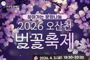 [ 한국미디어뉴스 이보영 기자 ] 오산문화재단은 오는 4월 3일 오후 6시 30분 오산천 야외무대(종합운동장 뒤편)에서 시민들과 함께하는 봄맞이 ‘2026 오산천 벚꽃 축제’를 개최한다. 이번 행사는 따뜻한 봄의 시작을 알리며 시민들에게 특별한 추억을 선사하기 위해 마련된 것으로, 가수 황민호의 축하 공연을 비롯해 점등식과 폭죽 퍼포먼스가 어우러져 오산천 일대를 화려한 봄밤의 분위기로 물들일 예정이다. 행사 당일에는 음악과 빛, 불꽃이 조화를 이루는 다양한 프로그램이 진행되며, 남녀노소 누구나 함께 즐길 수 있는 열린 문화행사로 시민들의 큰 호응이 기대된다. 오산문화재단 관계자는 “오산천에서 펼쳐지는 이번 축제가 시민들에게 특별한 봄밤의 추억으로 남길 바란다”며 “앞으로도 시민들이 일상 가까이에서 문화와 예술을 향유할 수 있도록 다양한 프로그램을 지속적으로 마련하겠다”고 밝혔다.