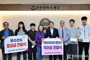 [ 한국미디어뉴스 이원희 기자 ] 인천 동구장애인체육회는 지난 14일 제7회 인천광역시장애인생활체육대회 입상 선수 및 제45회 전국장애인체육대회 출전선수를 초대해 격려금을 지급했다고 밝혔다. 이날 행사는 지난 인천시 장애인생활체육대회 탁구 종목에서 금메달과 동메달을 딴 선수들의 노고를 치하하고, 전국장애인체육대회에 출전하는 선수들을 격려하기 위해 마련됐다. 김찬진 동구청장은 우수한 성적으로 입상한 선수와 전국장애인체육대회 출전하는 선수에게 격려와 응원의 메시지를 전달했다. 김찬진 동구청장은 “장애를 딛고 끊임없이 도전하는 선수의 열정과 노력이 자랑스럽다”며 “동구 장애인 체육활성화를 위해 적극 지원하겠다”고 말했다. 한편, 동구장애인체육회는 지역 장애인들이 체육을 통해 건강한 삶을 누릴 수 있도록 장애학생 대상 여름방학 체육활동, 장애인 탁구 교실, 수영교실, 파크골프 등의 프로그램을 운영중에 있으며 앞으로도 다양한 종목의 생활체육 프로그램과 체육 활동을 지원할 예정이다.