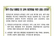 [ 한국미디어뉴스 이종철 기자 ] 전라남도교육청과 전라남도가 광주·전남 대통합과 교육 대전환을 위한 공동선언문을 발표했다. 김대중 교육감과 김영록 지사는 8일 오전 전남도청에서 만나 최근 논의되고 있는 광주·전남 통합과 관련, “지역 소멸 위기를 넘어 광주·전남 대통합을 주도하고, 대한민국의 새로운 성장축이 될 ‘(가칭) 광주전남 특별시’ 출범이 역사적 사명임을 깊이 공감한다.”며 이같이 선언했다. 전남교육청은 4개 항으로 된 선언문에서 지역 소멸 위기 극복을 위한 광주·전남 대통합에 적극 찬성하며, 통합 특별시의 성공적인 안착을 위해 전남도와 긴밀히 협력하기로 했다. 이어, ‘광주·전남 행정통합 추진협의체’에 핵심 주체로 참여하여, 선진형 초광역 통합모델을 구축하는 데 협력하기로 했다. 또한, 전남교육청은 교육·학예 분야와 관련된 사항에 대해 광주광역시교육청과 함께 법안 작성 및 검토에 앞장서기로 했다. 이와 함께, 전남교육청과 전남도는 통합 과정에서 교육 현장의 목소리를 반영하며, 교육 현장이 체감할 수 있는 교육 대전환과 미래 인재 양성을 위해 모든 역량을 결집한다는 데 합의했다