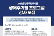 [ 한국미디어뉴스 김만길 기자 ] 인천시 남동구 구립도서관은 3~12월까지 운영하는 ‘2026년 상·하반기 생애주기별 프로그램’에 함께 할 프로그램 강사를 공개 모집한다고 12일 밝혔다. 올해 구립도서관 4개관(남동논현, 소래, 서창, 만수2동어린이도서관)의 생애주기별 프로그램은 10개 분야로 구성돼 운영될 예정이다. 강사 모집은 유아·아동 대상의 영어·한국사·생태·미술·전래놀이·경제 등 8개 강좌와 성인 대상의 책 놀이·영어독서 지도 교육 등 2개 강좌를 대상으로 한다. 관련 분야 전공자, 교육과정 이수자, 자격증 소지자, 강의 경력자라면 누구나 강사로 지원할 수 있다. 지원자는 강사지원서·강의계획서·자기소개서 등 서류를 준비해 1월 16일까지 남동논현도서관 또는 서창도서관에 방문하거나 이메일을 통해 제출하면 된다. 구는 매년 강사 공개 모집을 통해 여러 분야의 우수한 강사를 발굴·선발하여 생애주기별 프로그램을 진행하며, 지역주민의 교육적 삶의 질 향상과 독서문화 활성화를 통해 지역 내 독서문화 진흥을 도모할 수 있기를 기대하고 있다. 자세한 사항은 남동구립도서관 홈페이