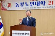 [ 한국미디어뉴스 이원영 기자 ] 김완근 제주시장은 2월 11일 조천주민교류센터 회의실에서 열린 제21기 동부노인대학 졸업식에 참석해 축하 인사를 전했다. 이번 졸업식은 졸업생 32명과 내빈 등이 참석한 가운데 학사보고, 졸업증서 수여, 표창 수여, 축사 등의 순서로 진행됐다. 제주시 동부노인대학은 2년 과정의 교육프로그램으로, 어르신들의 삶의 질을 높이고 건강한 노후 생활을 지원하기 위해 운영되고 있다. 프로그램은 매주 화요일과 수요일 2시간씩 진행되며, 노인 교양, 건강관리, 정치·사회·시사 상식, 문화 체험 활동 등 다양한 내용으로 구성돼 있다. 김완근 제주시장은 “노인대학을 졸업하신 여러분께 진심으로 축하의 말씀을 드리고, 나이를 뛰어넘는 여러분의 열정과 도전은 우리 모두에게 큰 울림을 주고 있다”며, “병오년 새해 배움의 기쁨이 여러분의 삶의 버팀목이자 활력이 되어 언제나 건강하고 행복한 나날을 이어가시길 바란다”고 말했다.
