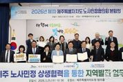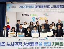 [ 한국미디어뉴스 이원영 기자 ] 인공지능·디지털 기술 확산과 기후위기로 일하는 방식이 빠르게 바뀌는 가운데, 제주 노·사·민·정이 산업대전환 시대 노동자 보호와 안전한 일터 만들기에 함께 나섰다. 제주특별자치도는 25일 도청 탐라홀에서 2026년 제1차 제주노사민정협의회 본회의를 열어 ‘산업대전환 대응과 일터 위험격차 해소를 위한 제주특별자치도 노사민정 공동선언문’을 채택하고, 노사발전재단과 상생협력 업무협약을 체결했다. 회의에는 오영훈 제주도지사를 비롯해 조순호 한국노총 제주지역본부 의장, 한봉심 제주경영자총협회 회장, 박명순 한국여성경제인협회 제주지회장, 강동훈 제주도관광협회 회장, 정윤희 제주YWCA 회장, 김상중 광주지방고용노동청 제주노동기준조사센터 소장 등 노·사·민·정 위원들이 참석했다. 본회의에서는 제2차 제주도 노동정책 기본계획(2026~2030)과 올해 노동정책 중점 추진과제도 보고됐다. 제주도는 야외노동자를 위한 이동형 쉼터(‘ᄃᆞ라댕기는 쉼버스’) 신규 도입, 산재보험 지원 직종 확대(8개→10개), 심야 노동자 700명 대상 노동환경 실태조사, 성평등임금 공시 및 맞춤형 컨