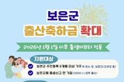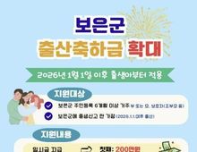 [ 한국미디어뉴스 김풍옥 기자 ] 충북 보은군은 저출생 극복과 출산·양육 가정의 경제적 부담 완화를 위해 2026년부터 출산축하금 지원을 확대 시행한다고 밝혔다. 그동안 군은 2025년까지 자녀 수와 관계없이 출생아 1명당 출산축하금 100만 원을 지급해 왔으나, 2026년부터는 자녀 수에 따라 지원 금액을 차등 지급하는 방식으로 제도를 개선해 양육 가정에 실질적인 도움이 되도록 했다. 지원 대상은 2026년 1월 1일 이후 출생아로, 첫째는 200만 원, 둘째 700만 원, 셋째 1,000만 원, 넷째 1,500만 원, 다섯째 이상은 2,000만 원을 지급한다. 첫째는 일시금으로 지급하며, 둘째 이상은 출생 후 4년간(0~4세) 연차별로 분할 지급하고 매년 생일이 속한 달의 다음 달 말까지 지급할 예정이다. 지원 기준은 2026년 1월 1일 이후 보은군에 출생신고 한 가정으로 보호자가 출생일 기준 6개월 이전부터 군에 주민등록을 두고 있어야 하며, 출산축하금 지원사업에 대한 자세한 사항은 건강증진과 모자보건팀으로 문의하면 된다. 홍종란 보건소장은 “출산축하금 지원 확대를 통해 출산과 양육에 대한