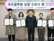 [ 한국미디어뉴스 이원희 기자 ] 인천 동구는 지난 17일‘2025년 민원처리 마일리지 운영 우수공무원’을 선정·포상하고 관련 간담회를 개최했다고 밝혔다. 이번 포상은 올해 신속한 민원 처리에 기여한 공직자를 격려하기 위해 마련됐다. 여성보육과 이진형 주무관이 민원처리 최우수 공무원에 선정됐으며, 이어 우수 공무원에는 아동청소년과 김은지 주무관, 도시경관과에 함인숙 주무관이 선정됐다. 교통과 신지혜 주무관, 건축과 고다영 주무관, 도시경관과 서기원 주무관은 장려상을 받았다. 이날 김찬진 동구청장은 민원처리 우수공무원에게 상장을 수여하고 담당자들로부터 다양한 민원 사례 및 고충 사항을 청취한 뒤 민원 업무 개선 방안 및 민원서비스 향상 등에 대해 의견을 나눴다. 김찬진 동구청장은“다양한 민원이 지속적으로 증가하고 있는 상황에서, 이를 해결하기 위해 묵묵히 최선을 다해주는 직원 여러분들의 노고에 깊이 감사드린다”며 “직원들의 사기진작과 구민 감동 행정서비스 제공을 위해 더욱 노력하겠다”고 말했다.
