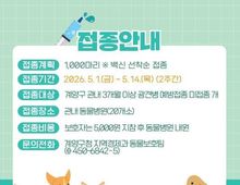 [ 한국미디어뉴스 이원영 기자 ] 인천광역시 계양구는 5월 1일부터 14일까지 지역 내 동물병원 20개소에서 반려견을 대상으로 ‘2026년 춘계 광견병 예방접종’을 실시한다고 밝혔다. 광견병은 감염된 동물에게 물렸을 때 사람에게도 전파될 수 있는 인수공통전염병으로, 가정에서 기르는 생후 3개월 이상의 개는 반드시 예방접종을 받아야 한다. 접종을 희망하는 주민은 백신이 조기에 소진될 수 있는 만큼, 동물병원 방문 전 전화로 잔여 수량을 확인해야 한다. 접종 시 보호자는 비용 5,000원을 부담하며, 방문 시 수의사와 충분한 상담을 거쳐 접종을 진행하는 것이 바람직하다. 구 관계자는 “광견병은 예방이 무엇보다 중요한 질병”이라며 “반려동물과 주민 모두의 안전을 위해 정해진 기간 내 예방접종에 적극 참여해 주시길 바란다.”라고 말했다. 기타 자세한 사항은 계양구청 지역경제과 동물보호팀으로 문의하면 된다.