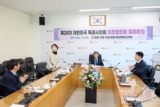 [ 한국미디어뉴스 이원영 기자 ] 용인특례시의회는 27일 11시 용인미르스타디움 3층 다목적실에서 경기도시·군의회의장협의회 제181차 정례회의를 개최했다고 밝혔다. 이번 정례회의는 경기도시·군의회의장협의회와 용인특례시의회가 주관했으며, 김승호 협의회장(동두천시의회 의장)을 비롯해 유진선 용인특례시의회 의장, 김운남 고양특례시의회 의장, 박태순 안산시의회 의장, 이지석 광명시의회 의장 등 경기도 내 31개 시·군의회 의장들이 참석했다. 아울러 이상일 용인특례시장이 참석해 축사를 전하며 회의 개최를 축하하고, 시·군 간 협력과 지방자치 발전의 중요성을 강조했다. 이날 회의에 앞서 용인특례시의회 의장단은 참석한 각 시·군의회 의장들을 환영하며 정례회의가 원활히 진행될 수 있도록 환대의 뜻을 전했다. 회의에서는 제180차 정례회의 결과 보고와 협의회 주요 활동 사항을 공유한 데 이어, 2025회계연도 수입·지출 예산 결산감사 보고와 안건 접수 현황에 대한 보고가 이뤄졌다. 이어 진행된 안건 심의에서는 ▲건설현장 하수급인의 생존권 보호와 하도급대금 직접지급 제도의 실효성 확보를 위한 ‘민사집행법 개정 촉구