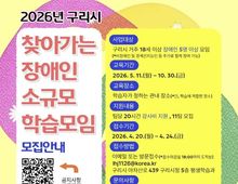 [ 한국미디어뉴스 김서안 기자 ] 구리시는 장애인의 특성을 고려한 찾아가는 평생학습 프로그램을 통해 학습 사각지대에 놓인 학습자를 발굴하고, 평생학습 기회를 확대하기 위해 ‘2026년 찾아가는 장애인 소규모 학습모임 지원사업’ 참여 모임을 4월 20일부터 모집한다고 밝혔다. 이번 사업은 구리시에 거주하는 장애인 5명 이상으로 구성된 학습모임을 대상으로 하며, 총 11개 팀을 선정해 팀당 20시간에 해당하는 강사비를 지원할 예정이다. 참여를 희망하는 모임은 프로그램, 강사, 학습공간을 자율적으로 구성해 신청서를 제출하면 된다. 다만, 평생학습 취지에 부합하지 않는 강좌는 지원 대상에서 제외된다. 신청은 구리시 평생학습포털에서 신청서 서식을 내려받아 작성한 후, 구리시청 평생학습과로 방문 또는 이메일로 접수하면 된다. 접수는 4월 20일부터 시작되며, 적합 여부 검토 후 우선순위에 따라 지원 대상이 선정된다. 선정된 학습모임은 5월 11일부터 10월까지 프로그램을 운영하게 된다. 구리시 관계자는 “장애인들이 더욱 익숙하고 편안한 공간에서 학습에 참여할 수 있도록 지원해 평생학습을 통한 삶의 만족도 향상과 사회 참