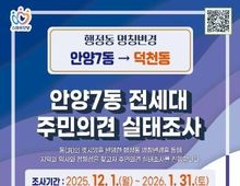 [ 한국미디어뉴스 이보영 기자 ] 행정동 명칭 변경 사업을 추진 중인 안양시가 만안구 안양7동의 행정동 명칭 변경을 위해 올해 12월 1일부터 내년 1월 31일까지 해당 동 전 세대를 대상으로 주민의견 실태조사를 실시한다고 1일 밝혔다. 이번 주민의견 실태조사는 안양7동의 행정동 명칭을 ‘덕천동’으로 변경하는 것에 대한 찬반 의견 조사다. 안양7동에 거주하는 전체 세대 중 60% 이상이 참여하고, 참여 세대의 과반수가 찬성할 경우 시는 명칭 변경을 추진할 예정이다. 조사방법은 올해 12월 1일부터 2026년 1월 31일까지 시 홈페이지를 통해 비대면 조사를 진행하고, 12월 18일부터 2026년 1월 31일까지 안양7동 행정동명칭변경추진위원회가 각 세대 방문조사를 병행하게 된다. 덕천(德泉)동은 어린이들이 샘물 솟듯이 씩씩하게 자라서 나라에 큰 일꾼이 되기를 바라는 뜻으로, 큰 덕(德)에 샘 천(泉)을 취해 붙여진 옛 지명이다. 시는 이에 앞서 지난 9월 12일부터 9월 30일까지 안양7동 주민들을 대상으로 행정동 명칭에 대한 선호도 조사를 진행했고, 조사에 참여한 646세대의 주민