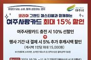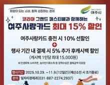 [ 한국미디어뉴스 이보영 기자 ] 여주시는 ‘2025 코리아 그랜드 페스티벌’ 기간인 오는 10월 29일부터 11월 9일까지 ‘여주사랑카드 최대 15% 할인’ 행사를 한다고 밝혔다. 여주사랑카드 사용자는 충전 시 10% 선할인(인센티브 충전)을 받을 수 있으며, 행사기간 내 결제 시 추가로 5% 후캐시백 지원을 받을 수 있다. 5% 캐시백 행사는 예산 소진시까지 1인 최대15,000원까지 혜택을 받을 수 있도록 지원하며, 지원 내역은 모바일 경기지역화폐 앱에서 실시간으로 확인할 수 있다고 안내했다. (5% 캐시백 행사에 민생회복 소비쿠폰, 농어민기회소득 등 정책수당은 결제 금액에 포함되지 않는다.) 코리아 그랜드 페스티벌은 내수 활성화를 위해 중소벤처기업부, 산업통상자원부 등 정부가 주관하는 소비 축제로 10개 부처와 3만개 유통사가 참여하며, 지역사랑상품권과 디지털온누리상품권 추가 할인, 상생소비복권, 카드사 캐시백 이벤트 등을 진행한다. 여주시 일자리경제과 관계자는 “이번 행사를 통해 지역 내 소비 진작, 지역 소상공인들의 매출 증대에 도움이 되기를 바란다”라며, “시민분들의 많은 관심과 참여를 바란다”고